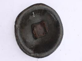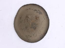 | Description / विवरण | A medium, circular and slightly convex sheild of iron alloy. There are four small guilded knobs in the center out of which one is completly missing and the back side of is padded between the knobs. Front is badly rusted and the edges are rough. Back is also polished in black colour and there is some rusting. |