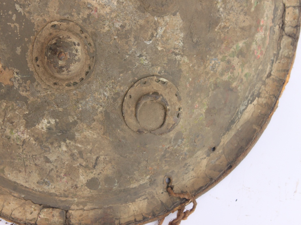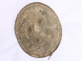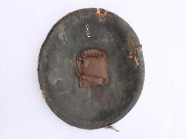 A medium, circular and slightly convex sheild of iron alloy. There are four small guilded knobs in the center out of which one is missing and the back side of is padded between the knobs. There are two strings attached as grip.Front is badly rusted and the edges are rough. Back is also polished in black colour and there is some rusting.