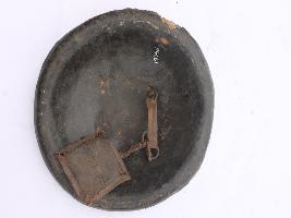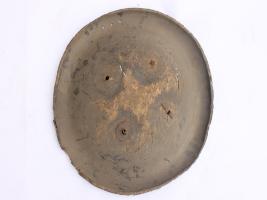 | Description / विवरण | A medium, circular and slightly convex sheild of iron alloy. There are four small guilded knobs but they are missing and the back side of is padded between the knobs and it is also loose . Front is badly rusted and the edges are rough. Back is also polished in black colour and there is some rusting. |