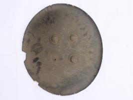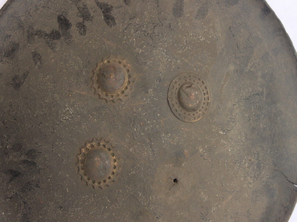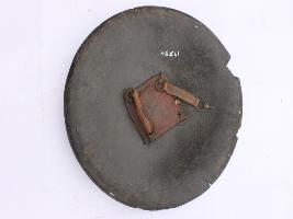 A medium, circular and slightly convex sheild of iron alloy. There are four small guilded knobs in the center out of which one is missing and the back side of is padded between the knobs. There are two strings attached as grip.Front is badly rusted and the edges are rough. Back is also polished in black colour and there is some rusting.