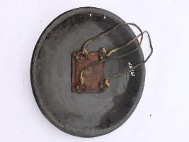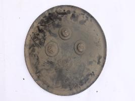 | Description / विवरण | A medium, circular and slightly convex sheild of iron alloy. One small guilded knobs in the center is missing, the back side is padded and two strings are attached as grip. Front is badly rusted and the edges are rough. Back is polished in black colour and there is some rusting. |