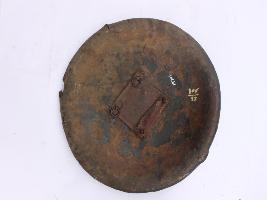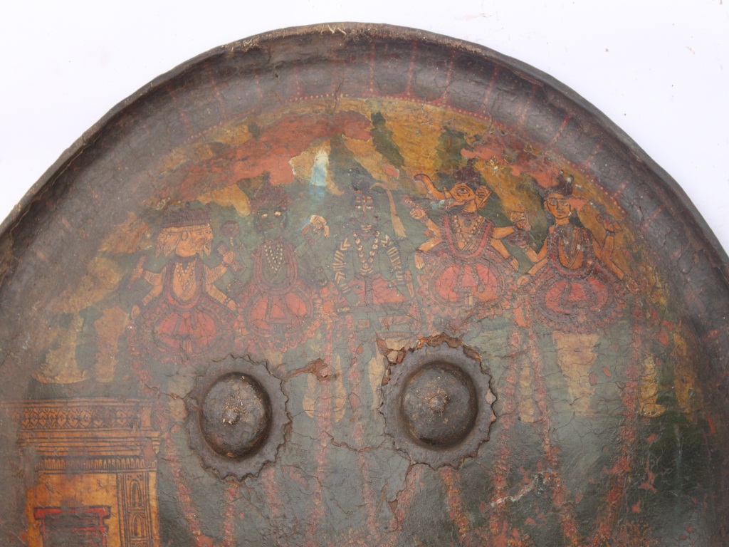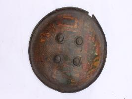 A medium, circular and slightly convex shield of iron alloy. There are four small gilded knobs in the center and the back side of is padded between the knobs. Front is badly rusted and the edges are rough. Back is also polished in black colour and there is some rusting. Front side of the shield is painted with mythological story of Ram-avatar. Figures of Ram and Lakshman are clearly visible and the architectural setting and jungle is clearly visible but it is not clearly visible. Background is painted with decorative foilage. The colour pallet is varied but is dominated by reds, orange, mustard and browns but other colours like black, blue, cream, white and green.
