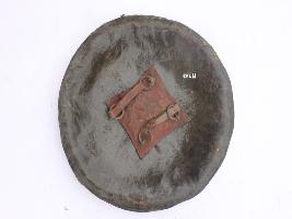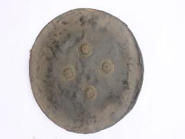 | Description / विवरण | A medium, circular and slightly convex shield of iron alloy. There are four small gilded knobs in the center and the back side of is padded between the knobs. Front is badly rusted and the edges are rough. Back is also polished in black colour and there is some rusting. |