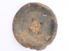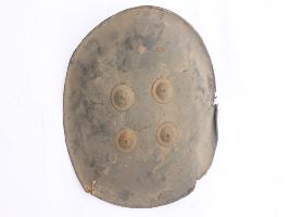 | Description / विवरण | A medium, circular and slightly convex shield of iron alloy. There are four small gilded knobs in the center and the back side of is padded between the knobs but the pad is missing. Front is badly rusted and the edges are rough. Back is also polished in black colour and there is some rusting. |
