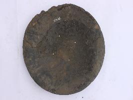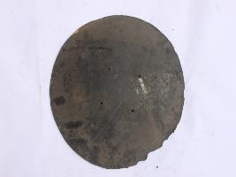 | Description / विवरण | A medium, circular and slightly convex shield of iron alloy. Pad and knobs are missing. Front is badly rusted and the edges are rough. Back is also polished in black colour and there is some rusting. |