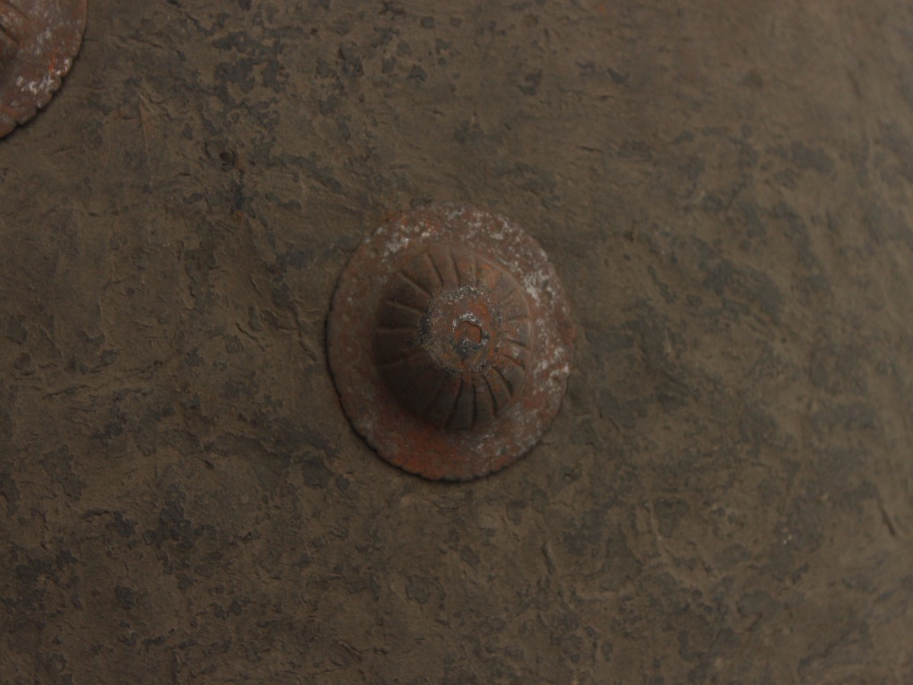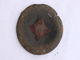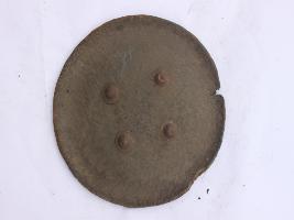 A medium, circular and slightly convex shield of iron alloy. There are four small gilded knobs in the center and the back side of is padded between the knobs. Front is badly rusted and the edges are rough. Back is also polished in black colour and there is some rusting.
