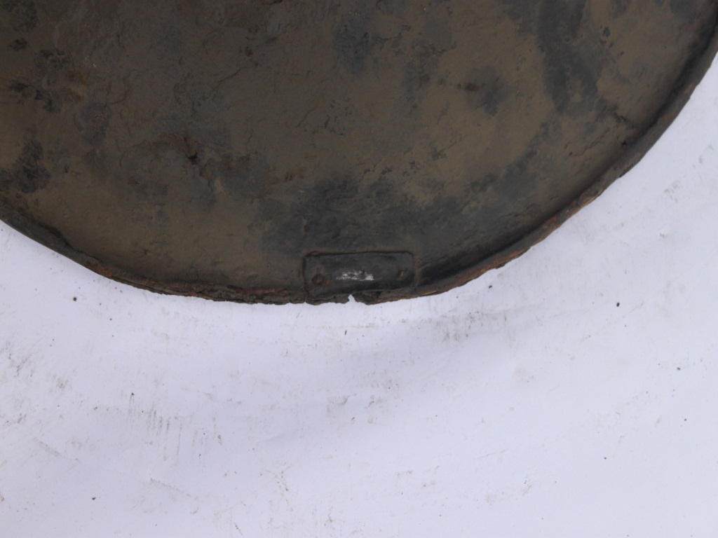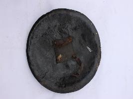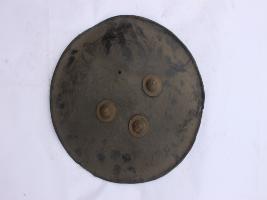A medium, circular and slightly convex shield of iron alloy. One knob is missing. Front is badly rusted and the edges are rough. Back is also polished in black colour and there is some rusting.
