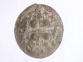 | Description / विवरण | A medium, circular and slightly convex sheild of iron alloy. There are four small guilded knobs in the center and the back side of is padded between the knobs. Front is badly rusted and the edges are rough. Back is also polished in black colour and there is some rusting. |