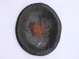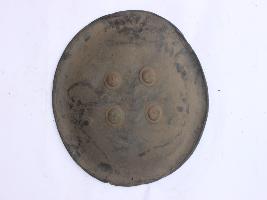 | Description / विवरण | A medium, circular and slightly convex sheild of iron alloy. There are four small guilded knobs in the center and the back side of is padded between the knobs. Front is badly rusted and the edges are rough. Back is also polished in black colour and there is some rusting. |