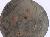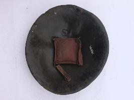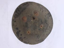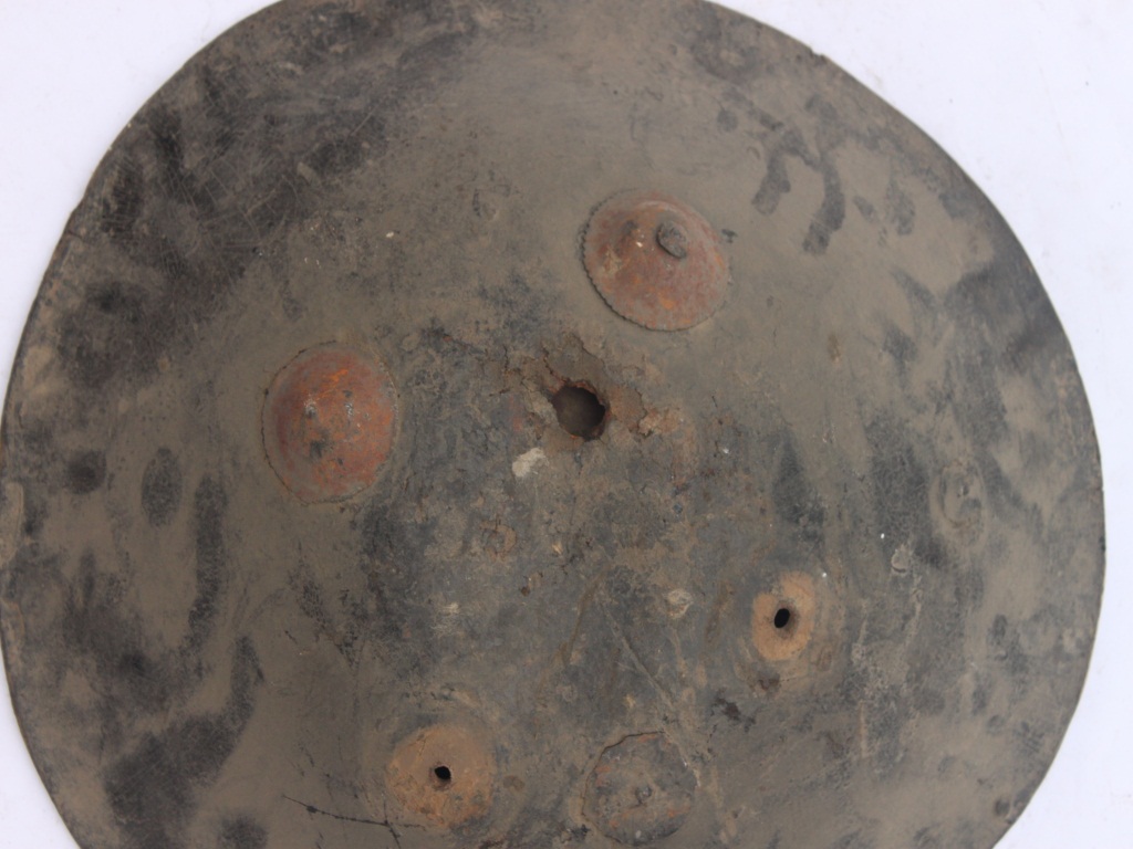 A medium, circular and slightly convex sheild of iron alloy. There are four small guilded knobs in the center out of which two are missing and the back side of is padded between the knobs. There are two strings attached as grip.Front is badly rusted and the edges are rough. Back is also polished in black colour and there is some rusting.