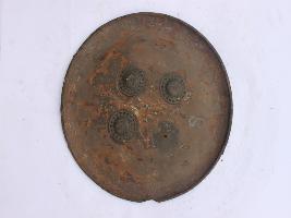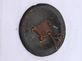 | Description / विवरण | A medium, circular and slightly convex shield of iron alloy. There are four small gilded knobs in the center out of which one is missing and the back side of is padded between the knobs. There are two strings attached as grip.Front is badly rusted and the edges are rough. Back is also polished in black colour and there is some rusting. |