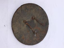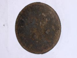 | Description / विवरण | A medium, circular and slightly convex sheild of iron alloy. There are four small guilded knobs in the center out of which two are missing and the back side of is padded between the knobs. There are two strings attached as grip.Front is badly rusted and the edges are rough. Back is also polished in black colour and there is some rusting. |