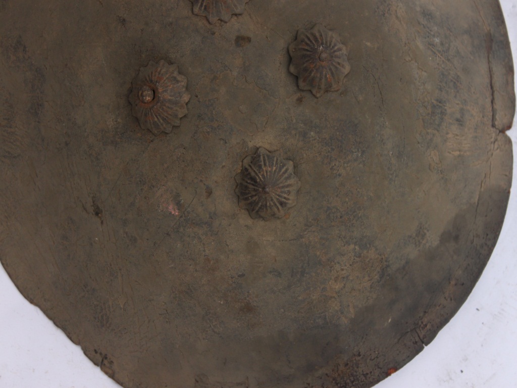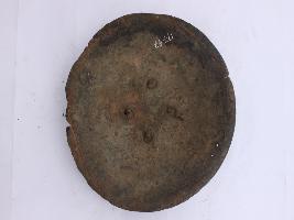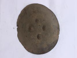 A medium, circular and slightly convex sheild of iron alloy. There are four small guilded knobs in the center and the back side is not padded between the knobs. Front is badly rusted and the edges are rough. Back is also polished in black colour and there is some rusting.