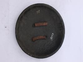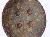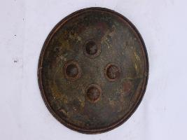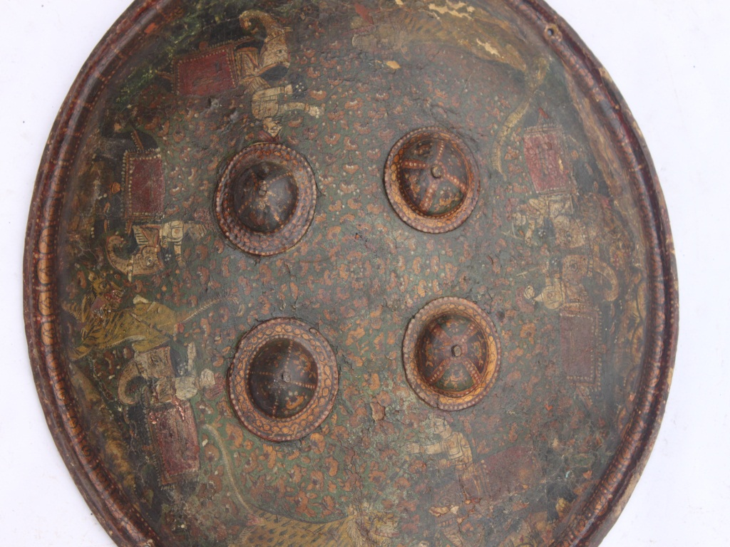 A medium, circular and slightly convex sheild of iron alloy. There are four small guilded knobs in the center out of which two are missing and the back side of is not padded between the knobs. There are two strings attached as grip.Front is badly rusted and the edges are rough. Back is also polished in black colour and there is some rusting. A panaromic jungel cum procession scene painted on the sheild. Procession of six elephants mounted by men, deers and there are two tigers as well.