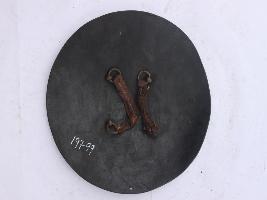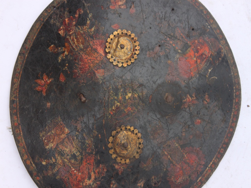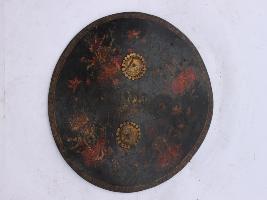 A medium, circular and slightly convex sheild of iron alloy. There are four small guilded knobs in the center out of which two are missing and the back side of is not padded between the knobs. There are two strings attached as grip.Front is badly rusted and the edges are rough. Back is also polished in black colour and there is some rusting. There are four deities are painted on the sheild. Ganesh and Brahma can be indentified and the other two seem to be Shiva and Visnu.