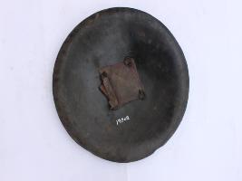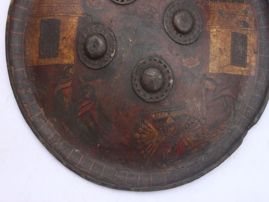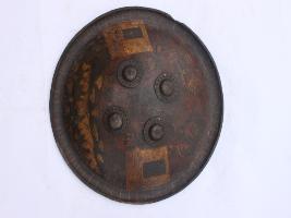 It is an ornamented shield. The front is painted, knobs, pad and grip are intact. The painting is the front is picked up from Ramayan. Sides of the shield are painted with an architectual setting of fort or palace. But the theme cannot be identified. A figure with twenty hands and two other figures are seen. The two figures can be of Hanuman and Vibhishan. There is a lack of perspective in this paintings and sense of proportion is also missing. Colours mainly used are cream, white, black, brown, red and are muted in character.