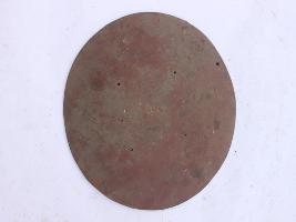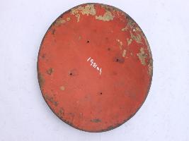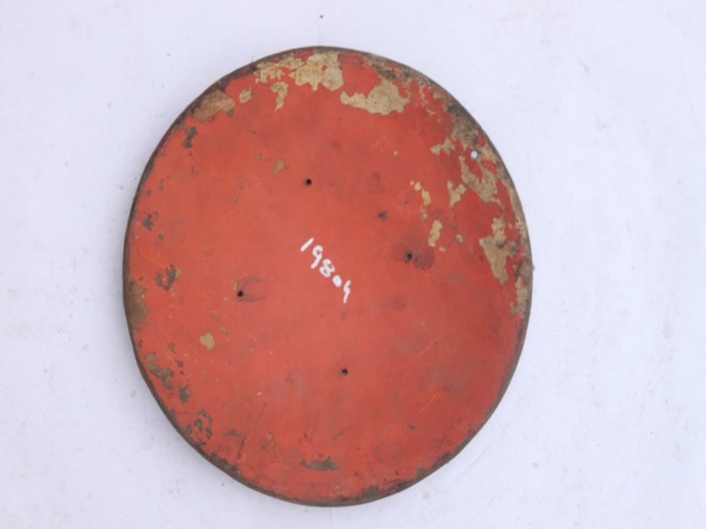 It is a plain convex shield and rim is missing. There are no knobs in front and pad is also missing. Shield is damaged and vermillion colour is painted.