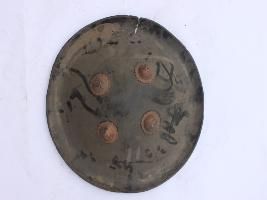 | Description / विवरण | It is a plain shield without rim but four knobs are intact. The edges are cracked and badly damaged. There is no decoration on the shield and it rusted. |