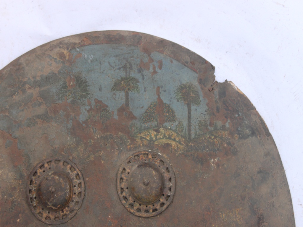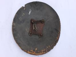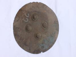It is a plain shield without rim but four knobs are intact. The edges are cracked and badly damaged. There is no decoration on the shield and it rusted. There is a painting but it is badly damaged.