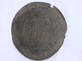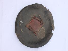 | Description / विवरण | It is a plain shield without rim but four knobs are intact. The edges are cracked and badly damaged. There is no decoration on the shield and it rusted. |