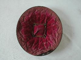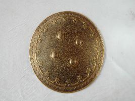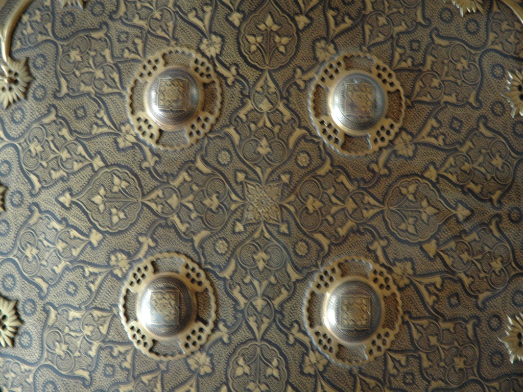 It is a convex shield with four gilded knobs. The front part is ornamented with inlay work and decorated further in emboss on the rim. The design is geometric. Back side is padded with velvet lining, but it is damaged and grip is missing.