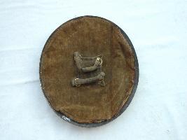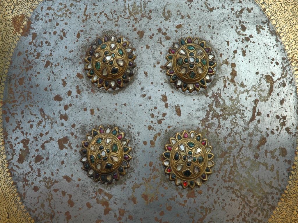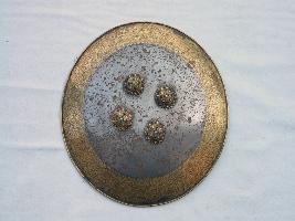 It is an ornamented shield. The front is painted, knobs, pad and grip are intact. Border of the shield is damascened in gold. The rim is gilded in golden colour. The knobs are intact and is also gilded in golden. The rest of the rim is silver in colour. The back is padded and grip is intact.