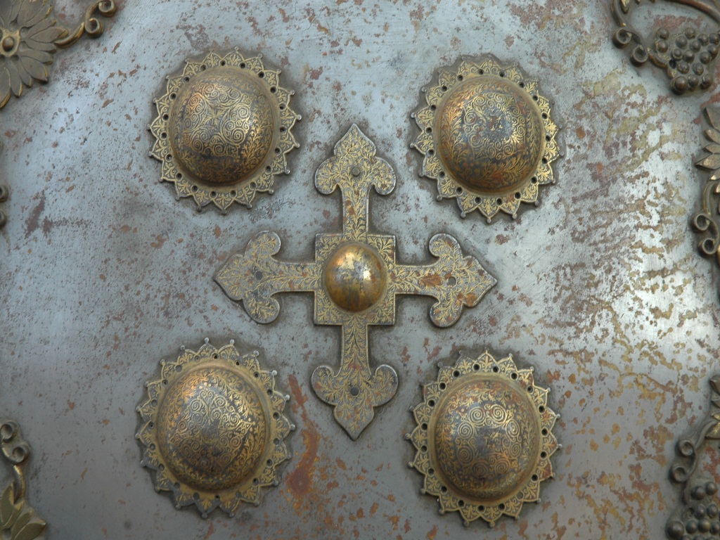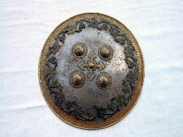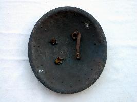 It is a convex shield and rim is intact. The gilded knobs in front and pad is also missing. Between the knobs a there is an ornamented cross plate and the rim is also ornamented with floral designs.