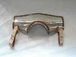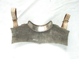 | Description / विवरण | It is a neck guard which rests just over the shoulders. The front and back side are attached with a strap. The rim is highlighted with a copper lining. There is no ornamentation as such. |