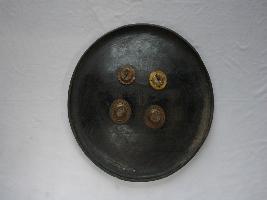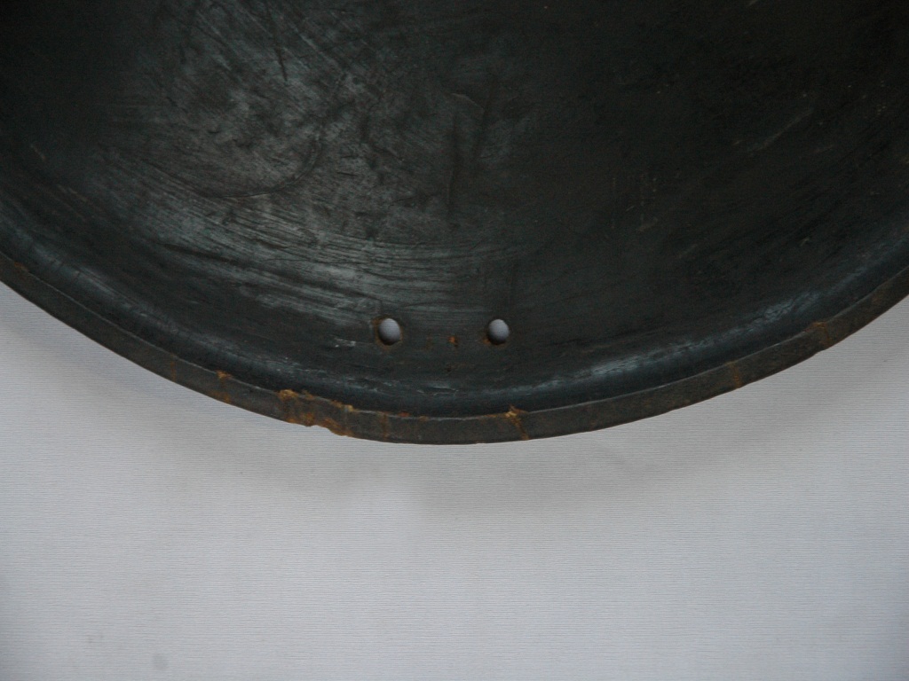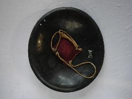 It is a convex shield with rim intact. Four knobs are present but two of them are damaged. Pad is intact with grip. The shield is black in colour.