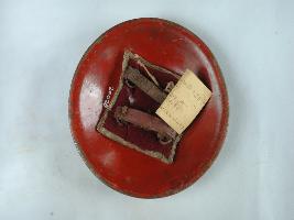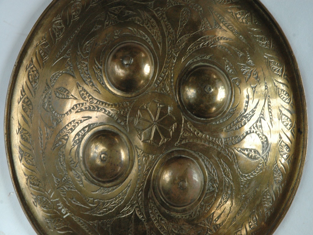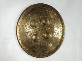 A shield of damascus steel, hemispherical in shape with four knobs damascused in gold supported by four steel rings from inside. It a lining from the reverse side.