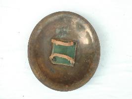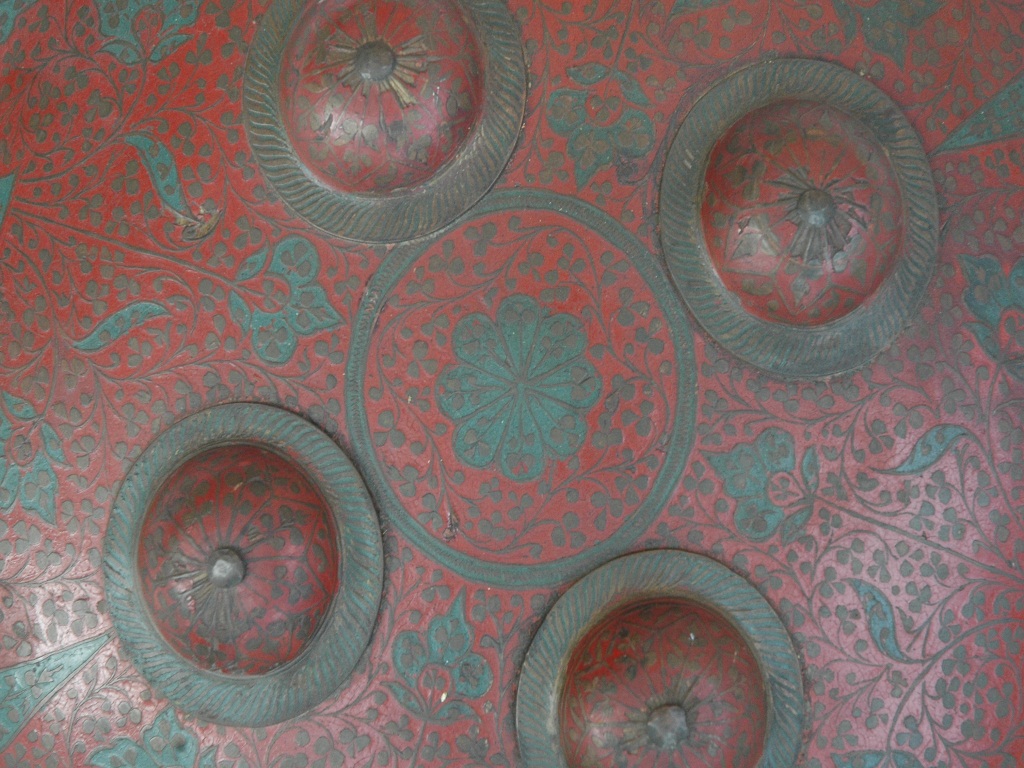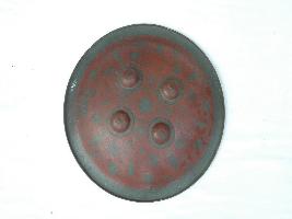 A shield of damascus steel, hemispherical in shape with four knobs with floral designs on it supported by four steel rings from inside. It a lining from the reverse side. The front side is decorated with floral and creeper design. The shield is rusted and one of the knobs is loose.