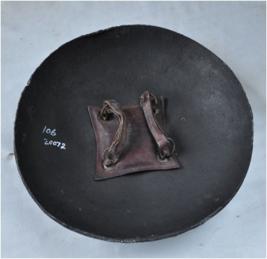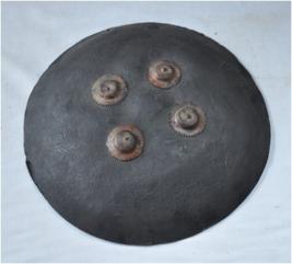 | Description / विवरण | A 19th century shield made of rhinceros hide. It has 4 knobs in the centre. The total diameter of the shield is 38.6 cm. The edges are damaged. Rusted. |