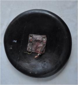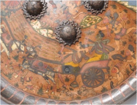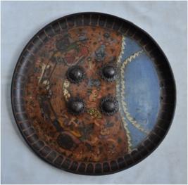 A 19th century shield made of rhinceros hide. It has 4 knobs in the centre. The shield is decorated with paintings of characters from Ramayan on the front. The lacquer is damaged and the knobs are losoe. Rusted. The inner padding is damaged.