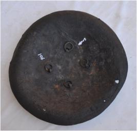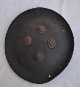 | Description / विवरण | A 19th century shield made of rhinceros hide. It has 4 knobs in the centre. The toral diamter of the shield is 44 cm. The inner pad is missing and the shiled is damaged. |