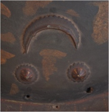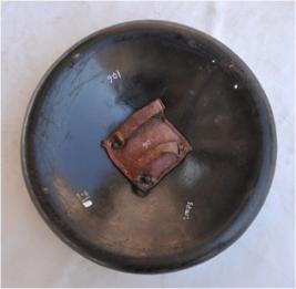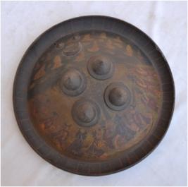 A 19th century shield made of rhinceros hide. It has 4 knobs in the centre. The shield is decorated with painting on the front. The front side also has some insignia. The knobs are losoe. Rusted.