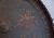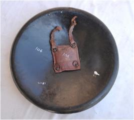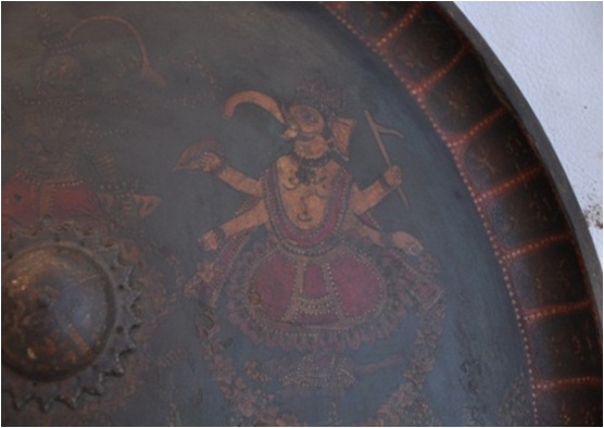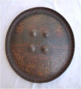 A 19th century shield made of rhinceros hide. It has 4 knobs in the centre. The shield is decorated with religious painting of Lord Ganesha on the front which has now faded. Rusted. The knobs are loose and the leather belt is broken. The edges are damaged.