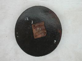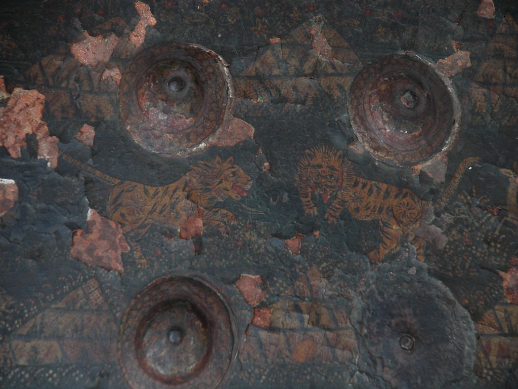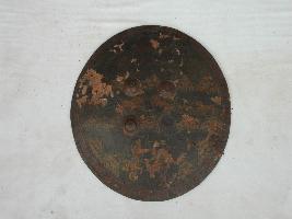 A 19th century shield made of rhinceros hide. It has 3 knobs in the centre. Originally it may have had 4 knobs but one is missing. The shield is decorated with lacquer painting which has now faded. Rusted.