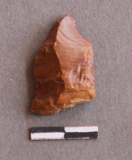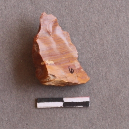 | Description / विवरण | It is lithic debitage of stone with flaked bulb of percussion seen on it. Sharp edges shows flakes had been removed. It is woody agate with cortex on one side, ripples are seen. |