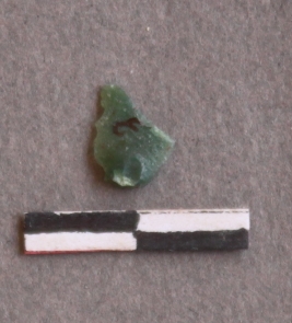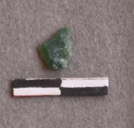 | Description / विवरण | Very small flake of jasper, green in color striking platform and bulb of percussion visible. |