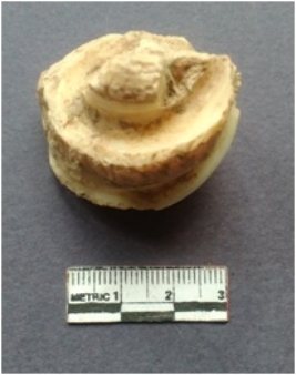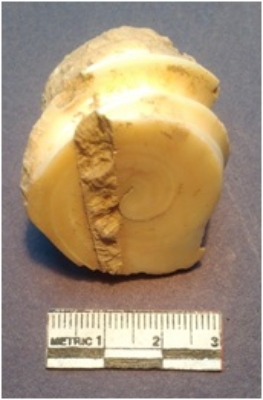 | Description / विवरण | It is a broken part of a shell columella, saw cut marks visible on the surface, having glossy natural shine on the surface. |