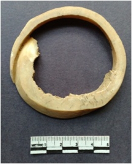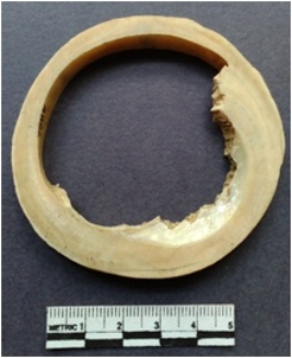 | Description / विवरण | It is a complete shell circlet, unfinished and unpolished. Circular in shape and saw cut marks on the surface, dull whitish in color. |