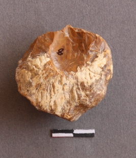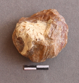 | Description / विवरण | It is liithic debitage, flaked with bulb of percussion seen on stone. It is chert nodule with calcium deposition on surface. |