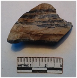 | Description / विवरण | It is a jasper flake, surface having multiple bands and ripples are visible on the flake scars. Striking platform on the positive end. |