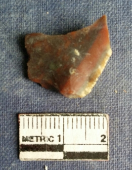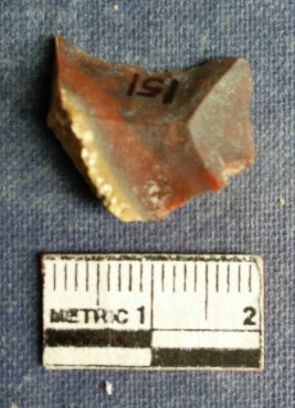 | Description / विवरण | This is a jasper flake with bulb of percussion seen on one side with a prominent striking platform. A small fraction of cortex with calcium deposite seen on one corner. Cut ridges in a triangular shape on the opposite side. |