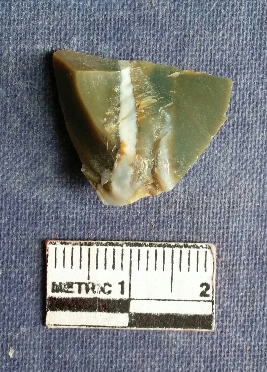 | Description / विवरण | This is a jasper flake with a white band diagonally crossing the triangular piece. Flaked with sharp edge and ripples on the surface. |