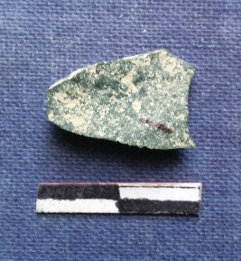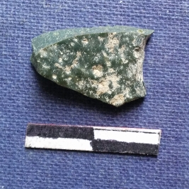 | Description / विवरण | Chert stone flaek with sharp cut edges and uneven surface dark green in color. |
