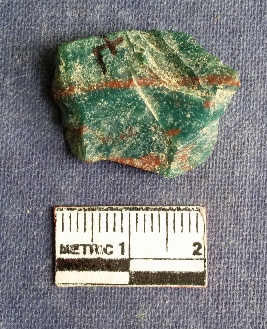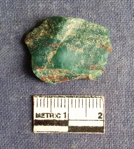 | Description / विवरण | This is a jasper flake, dark bluish green with crimton bands. Flakes removed. |