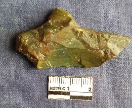 | Description / विवरण | This is a chert flake fragment, circular flake had been removed at places forming ripples around. |