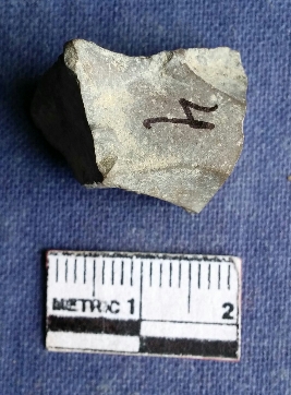 | Description / विवरण | Chert stone flake with rough cut ridges. |