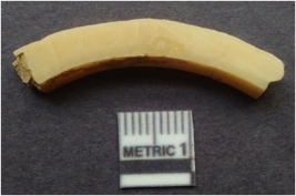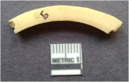 | Description / विवरण | Fragment of shell circlet with squarish section and striations. |